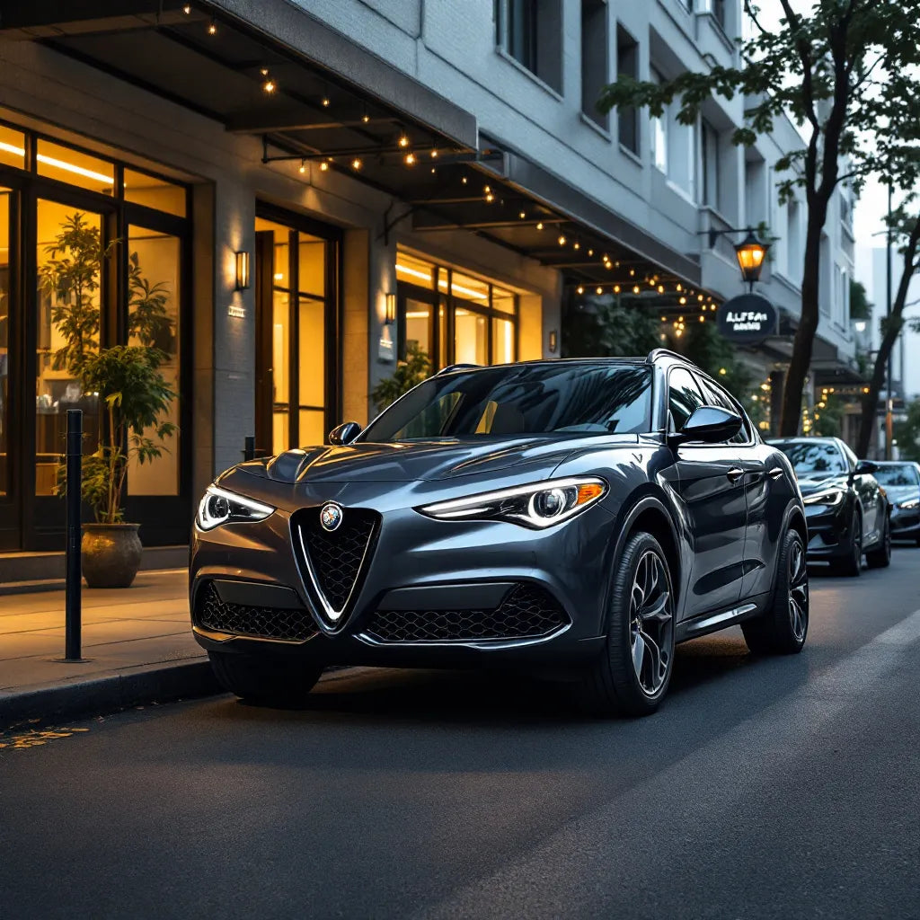 L'Alfa Romeo Stelvio arbore un design résolument italien, à la fois élégant et sportif. La face avant est dominée par la calandre triangulaire emblématique de la marque, entourée de phares effilés. La silhouette générale combine les lignes musclées d'une voiture sportive avec les proportions d'un SUV, créant une allure dynamique même à l'arrêt.